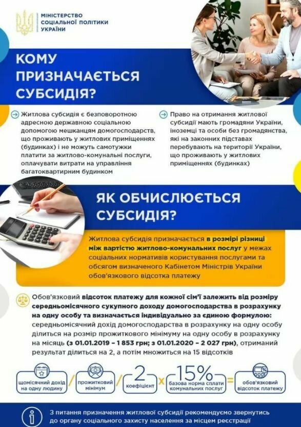 Завдяки програмі житлових субсидій малозабезпечені громадяни оплачують не повну вартість житлово-комуналтьних послуг, а лише частину платежу, яка залежить від розміру середньомісячного сукупного доходу домогосподарства в розрахунку на одну особу. Що менші доходи домогосподарства, то меншою є частка обов`язкової плати за житлово-комуналтьних послуги.